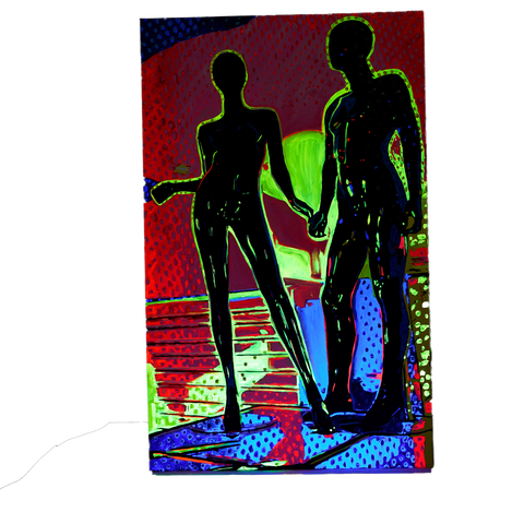 Rich black acrylic paint used with neon pinks, blues and yellows. Pop-art style created with Ben-Day dot technique. The neon paints are black light reflective creating a new visual experience under different lighting.